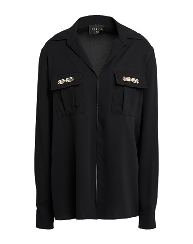 shirt, crepe, plain colour with appliqués, embellished, camp collar, long sleeves, hook fastenings, two chest pockets, machine wash or dry clean, do not bleach, do not tumble dry