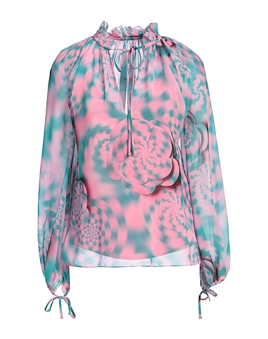 ruched top, chiffon, two-tone, ruffles, crewneck, long sleeves, dry clean, do not bleach, do not tumble dry