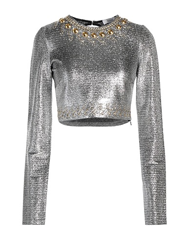 crop top, jersey, metallic, plain colour with appliqués, studs, crystals, crewneck, long sleeves, 1 button, zip fastening, stretch, dry clean, do not bleach, do not tumble dry, do not iron, this brand runs small