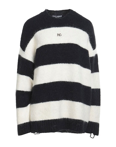 knitted, medium-weight knit, brand logo, striped, crewneck, long sleeves, no pockets, stretch, dry clean, do not tumble dry, do not bleach