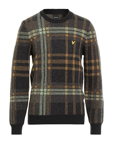 knitted, medium-weight knit, tartan pattern, brand logo, crewneck, long sleeves, stretch, hand wash, do not bleach, do not tumble dry