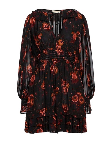 crepe, no appliqués, floral design, v-neck, long sleeves, fully lined, no pockets, trapeze style