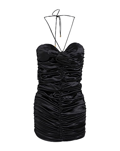 bodycon dress, satin, stretchy fabric, plain colour with appliqués, gathered, floral appliqués, halterneck, sleeveless, built-in shelf bra, zip fastening, dry clean, do not bleach, do not tumble dry, amp up the glamour with chic designer party outfits for your next event or fun night out