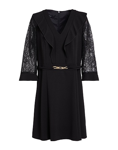 flared dress, crepe, lace, plain colour with appliqués, embellished, brand logo, v-neck, long sleeves, fully lined, zip fastening, stretch, dry clean, do not bleach, do not tumble dry, do not iron