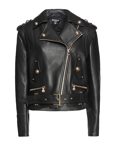 biker jacket, leather, belt, brand logo, button-embellished, plain colour, lapel collar, long sleeves, zipped cuffs, synthetic filling, lightweight padding, zip fastening, multipockets, contains non-textile parts of animal origin, do not wash, do not tumble dry