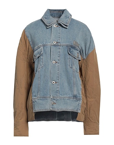 denim trucker jacket, denim, woven, two-tone, brand logo, medium wash, classic collar, single-breasted , long sleeves, unlined, two chest pockets, hand wash, do not bleach, do not tumble dry