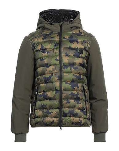 padded jacket, shell, quilted, stretchy fabric, brand logo, camouflage-print, hooded, long sleeves, synthetic filling, lightweight padding, zip fastening, zipped pockets, internal pocket, machine wash or dry clean, do not bleach, do not tumble dry
