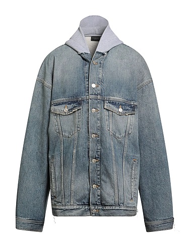 denim jacket, denim, french terry, faded, embroidered logo, two-tone, medium wash, hooded, long sleeves, unlined, button fastenings, slit pockets, two chest pockets, machine wash, do not bleach, do not tumble dry