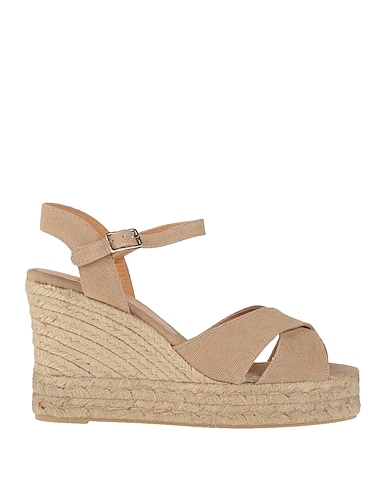canvas, no appliqués, solid colour, leather lining, buckle fastening, round toeline, wedge heel, rope wedge, rubber cleated sole, contains non-textile parts of animal origin