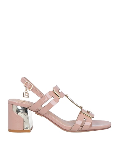 coated fabric, brand logo, metal applications, plain colour with appliqués, fully lined, wrapping straps closure, round toeline, square heel, rubber sole, ankle strap sandals