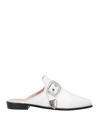 leather, buckle, plain colour with appliqués, leather lining, narrow toeline, flat, leather sole, contains non-textile parts of animal origin, mules model