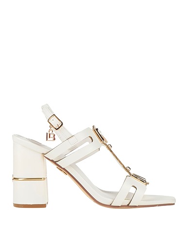coated fabric, metal applications, brand logo, plain colour with appliqués, fully lined, buckle fastening, square toeline, square heel, rubber cleated sole, ankle strap sandals