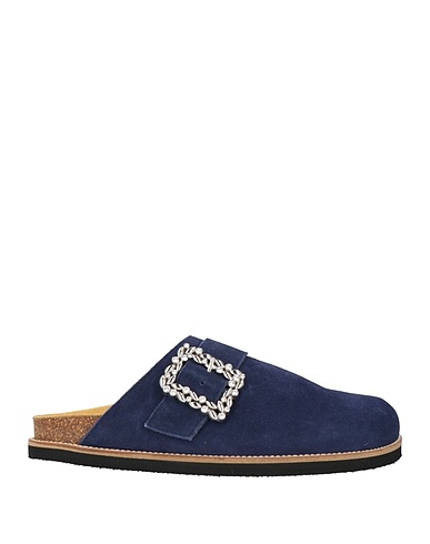 suede, buckle, crystals, plain colour with appliqués, leather lining, round toe, flat, rubber sole, contains non-textile parts of animal origin, mules