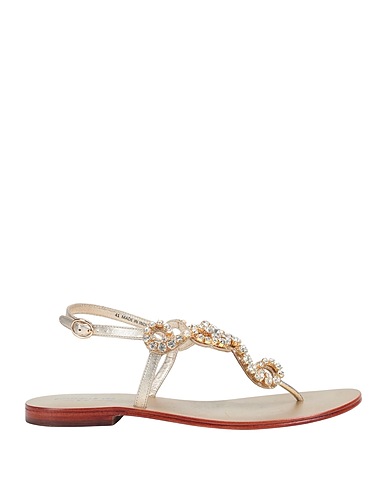 ankle strap thong sandals, leather, metallic, plain colour with appliqués, crystals, leather lining, buckle fastening, round toe, flat, leather sole, contains non-textile parts of animal origin