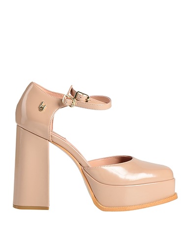 pumps, synthetic material, plain colour, brand logo, platform, leather lining, buckle-fastening ankle strap, round toe, square heel, covered heel, rubber sole, contains non-textile parts of animal origin