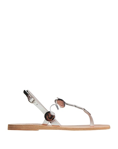 ankle strap thong sandals, leather, metallic, plain colour, no appliqués, leather lining, buckle-fastening ankle strap, round toe, flat, leather/rubber sole, contains non-textile parts of animal origin