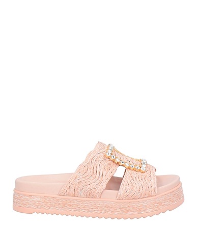 slide sandals, raffia, plain colour with appliqués, crystals, leather lining, round toe, flat, rubber sole, contains non-textile parts of animal origin