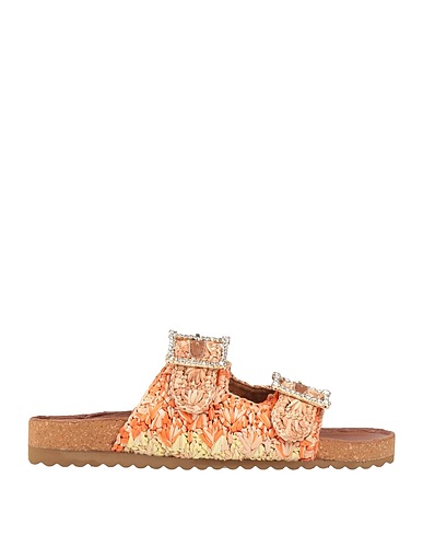 technical sandals, raffia, multicolour, crystals, leather lining, buckle fastening, round toe, flat, cork heel, rubber cleated sole, contains non-textile parts of animal origin
