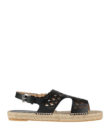 espadrille sandals, leather, plain colour, no appliqués, leather lining, buckle fastening, round toe, flat, rubber cleated sole, contains non-textile parts of animal origin