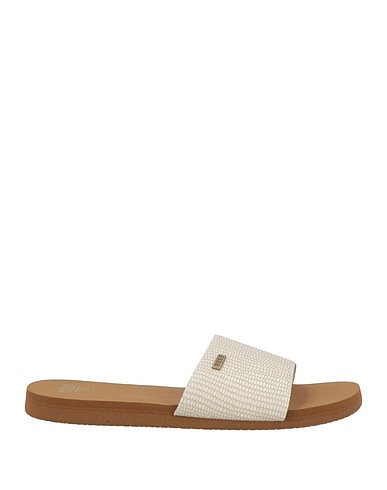 slide sandals, coated fabric, brand logo, lizard-print, rubber lining, round toe, flat, rubber cleated sole