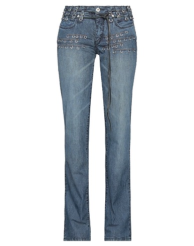 denim, metal applications, leather applications, plain colour with appliqués, dark wash, mid rise, flared cut, regular fit, zipper closure, 1 button, multipockets, contains non-textile parts of animal origin, flare & wide-leg