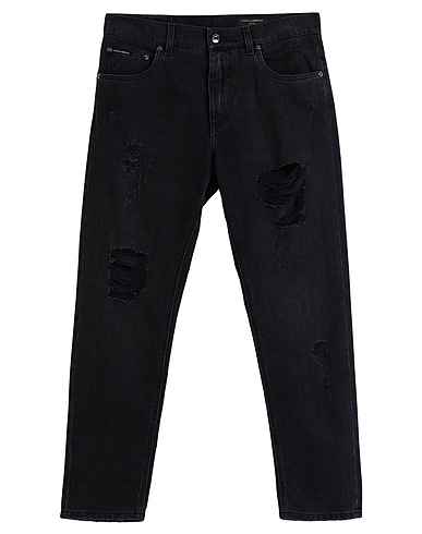 tapered jeans, denim, distressed, plain colour, brand logo, leather trims, coloured wash, high waisted, belt loops, tapered leg, regular fit, 1 button, zip fastening, five pockets, machine wash or dry clean, do not bleach, do not tumble dry, contains non-textile parts of animal origin
