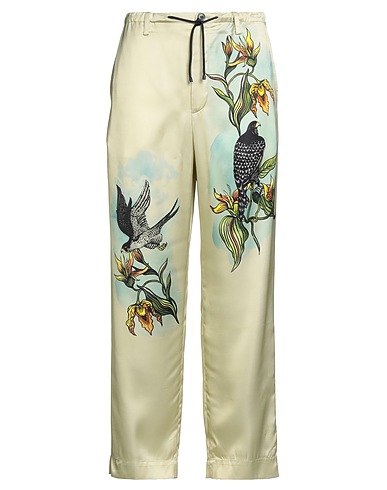 casual trousers, satin, plain colour with print, no appliqués, high waisted, elasticised waist, straight leg, regular fit, zip fastening, drawstring fastening, multipockets, dry clean, do not bleach, do not tumble dry