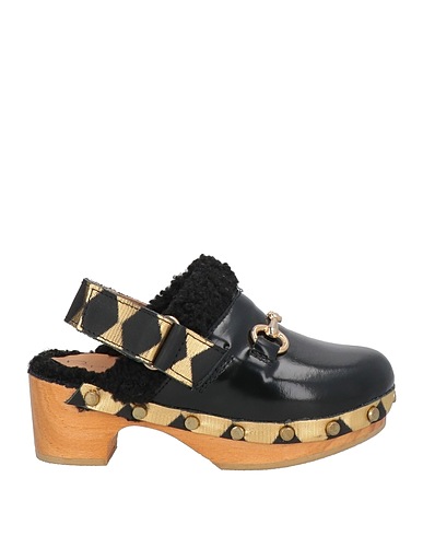 sandals, glossed-leather, sherpa fleece, metallic, two-tone, embellished, leather lining, velcro fastening, round toe, flat, rubber sole, contains non-textile parts of animal origin