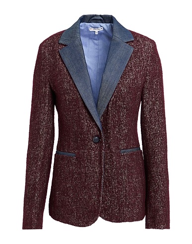 single-breasted blazer, bouclé, denim, two-tone, no appliqués, lapel collar, long sleeves, fully lined, button fastenings, multipockets, stretch, dry clean, do not bleach, do not tumble dry
