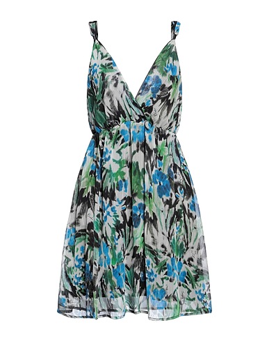 crepe, lamé, metal applications, multicolour, deep neckline, sleeveless, fully lined, no pockets, flared dress