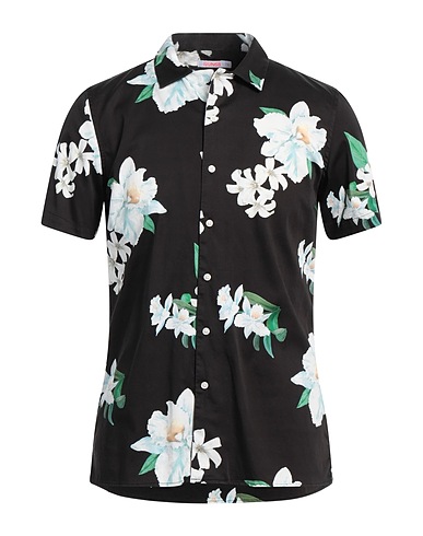 woven, brand logo, floral-print, lapel collar, short sleeves, button fastenings, no pockets, stretch, regular-fit shirt