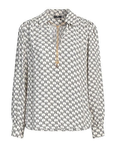 top, crepe, logo-print, detachable application, camp collar, long sleeves, buttoned cuffs, dry clean, do not bleach, do not tumble dry, this brand runs small