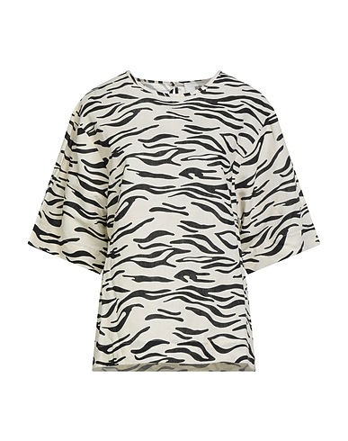 top, woven, zebra-print, no appliqués, crewneck, short sleeves, 1 button, side slit hemline, machine wash or dry clean, do not bleach, do not tumble dry