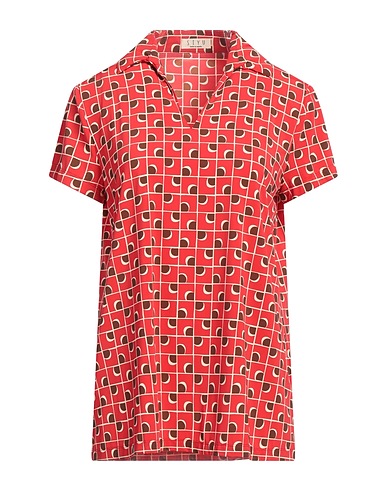 top, synthetic jersey, checked, no appliqués, camp collar, short sleeves, stretch, hand wash, do not bleach, do not tumble dry, do not iron