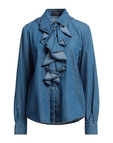 denim, plain colour, ruffles, medium wash, classic collar, long sleeves, snap-fastening cuffs, snap fastenings, machine wash or dry clean, do not bleach, do not tumble dry