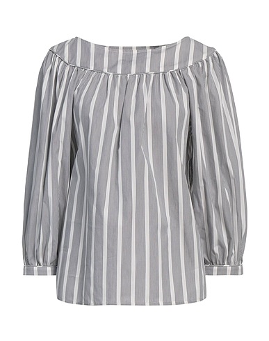 bohemian blouse, woven, striped, embroidered logo, crewneck, long sleeves, buttoned cuffs, machine wash or dry clean, do not bleach, do not tumble dry