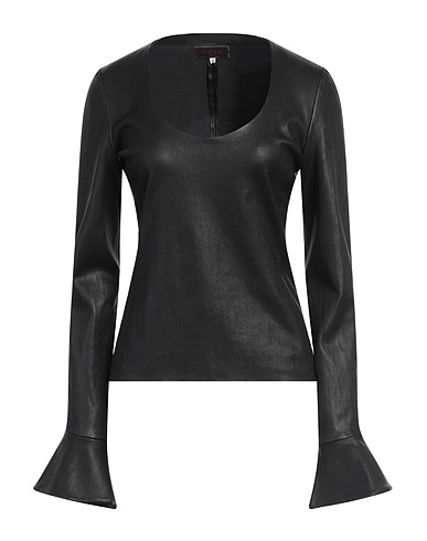 top, leather, plain colour, no appliqués, scoop neckline, long sleeves, contains non-textile parts of animal origin, machine wash, do not bleach, do not tumble dry
