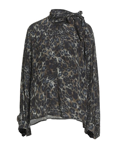 bow blouse, crepe, leopard-print, brand logo, gathered, long sleeves, buttoned cuffs, button fastenings, tie fastening, dry clean, do not bleach, do not tumble dry