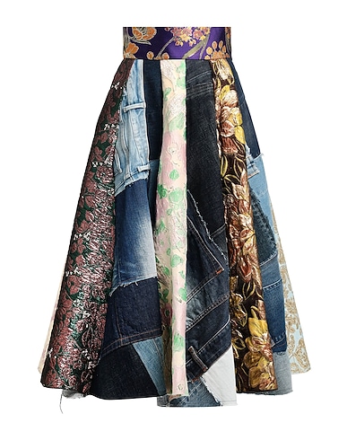 brocade, denim, lamé, no appliqués, patchwork, fully lined, snap fastenings, zip fastening, no pockets, dry clean, do not tumble dry, do not bleach, circle skirt