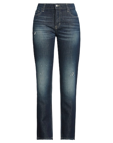 denim, worn effect, brand logo, solid colour, medium wash, high waisted, straight leg, comfort fit, button closing, five pockets, straight-leg model