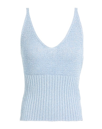 top, knitted, metallic, lightweight knit, plain colour, no appliqués, deep neckline, sleeveless, machine wash or dry clean, do not bleach, do not tumble dry