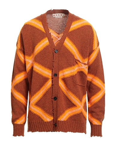 intarsia-knit, medium-weight knit, geometric-print, embroidered logo, long sleeves, button fastenings, one chest pocket, contains non-textile parts of animal origin, dry clean, do not bleach, do not tumble dry, this brand runs large
