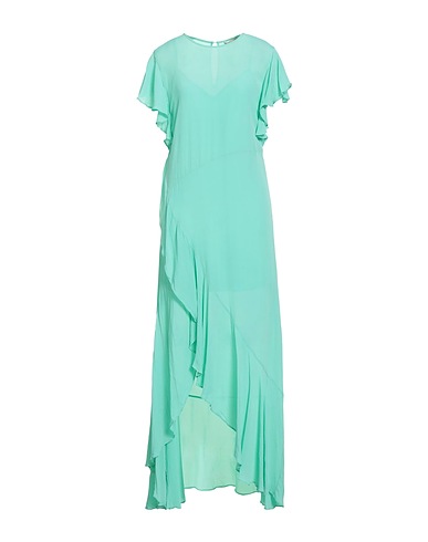 flared dress, crepe, plain colour, brand logo, ruffles, crewneck, short sleeves, internal slip dress, 1 button, zip fastening, without pockets, front slit, do not wash, do not tumble dry