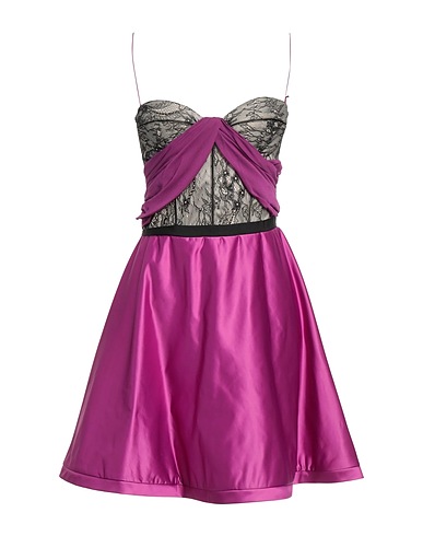 satin, lace, no appliqués, two-tone, deep neckline, sleeveless, unlined, zipper closure, no pockets, trapeze style