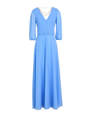 flared dress, crepe, plain colour with appliqués, embellished, brand logo, deep neckline, 3/4 length sleeves, fully lined, zip fastening, front slit, dry clean, do not bleach, do not tumble dry