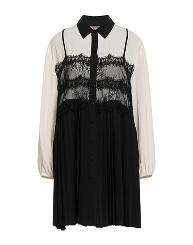 shirt dress, crepe, lace, two-tone, pleated, classic collar, long sleeves, buttoned cuffs, button fastenings, dry clean, do not bleach, do not tumble dry, do not iron