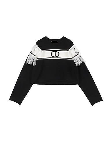 jacquard-knit, lightweight knit, brand logo, fringes, two-tone, crewneck, long sleeves, machine wash or dry clean, do not bleach, do not tumble dry