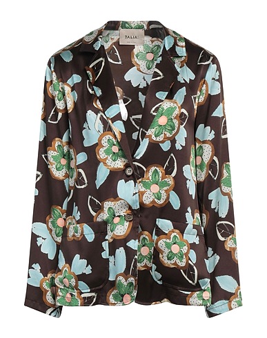 single-breasted blazer, satin, no appliqués, floral-print, lapel collar, long sleeves, unlined, multipockets, hand wash or dry clean, do not bleach, do not tumble dry