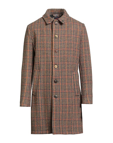 single-breasted coat, wool, prince of wales check, brooch, classic collar, long sleeves, partially lined, button fastenings, slit pocket, rear slit, dry clean, do not bleach, do not tumble dry
