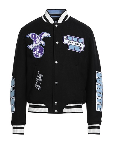 varsity jacket, felt, patches, embroidered logo, knitted trims, plain colour with appliqués, crewneck, long sleeves, fully lined, snap fastenings, welt pockets, dry clean, do not bleach, do not tumble dry